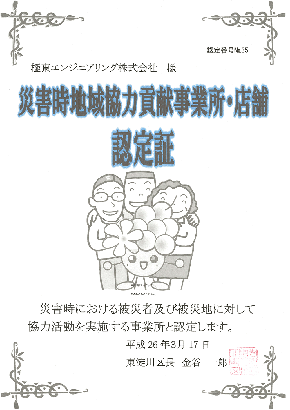 当社は、大規模災害発生時、企業・事業所や店舗等のもつ人的・物的資源を活用し、地域における災害発生時の初期・初動期に貢献する災害ボランティア事業所に登録しています。
